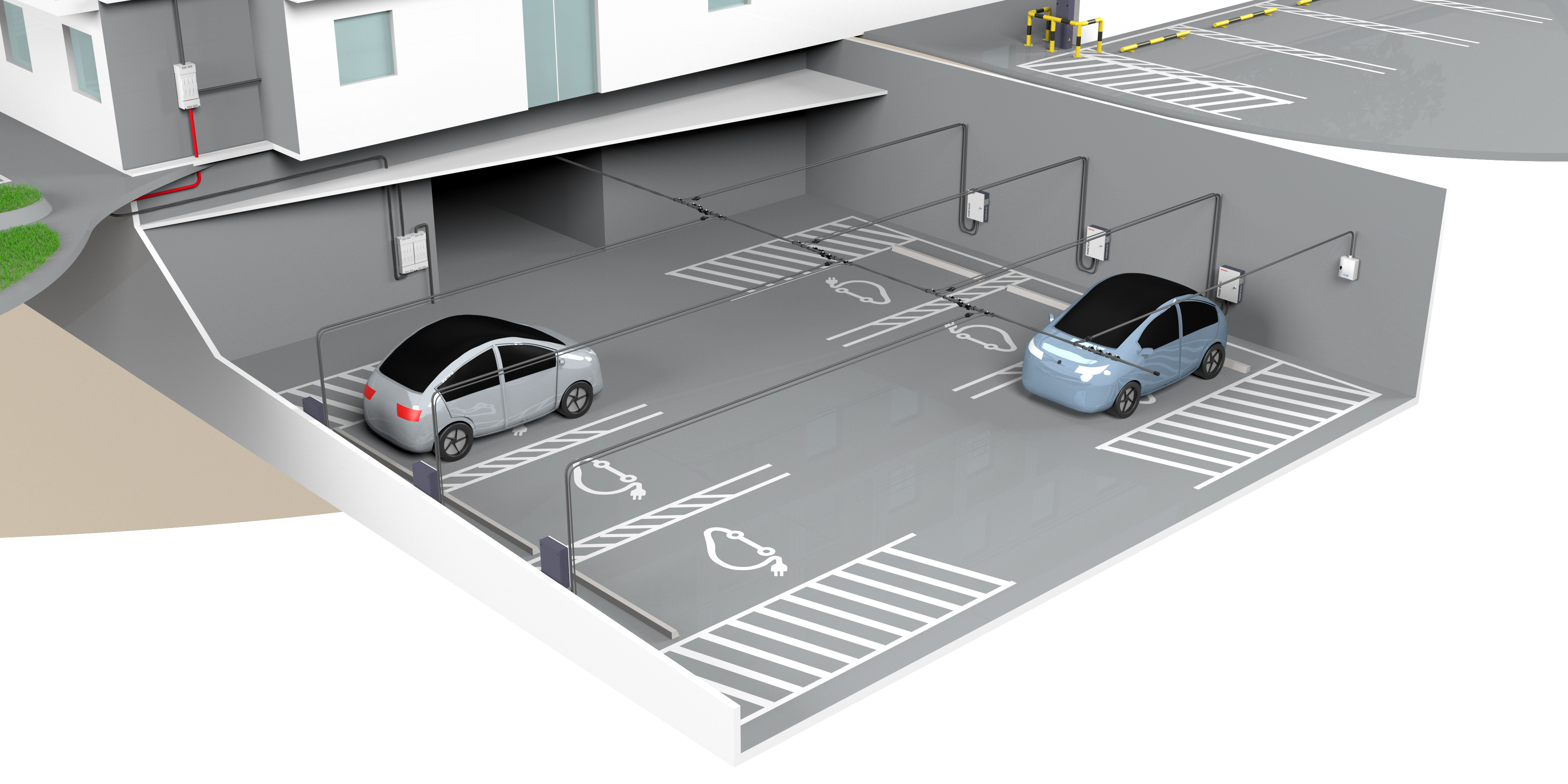 La solution à comptage individuel repose sur la création d’une infrastructure électrique collective permettant d’alimenter progressivement chaque place de stationnement.